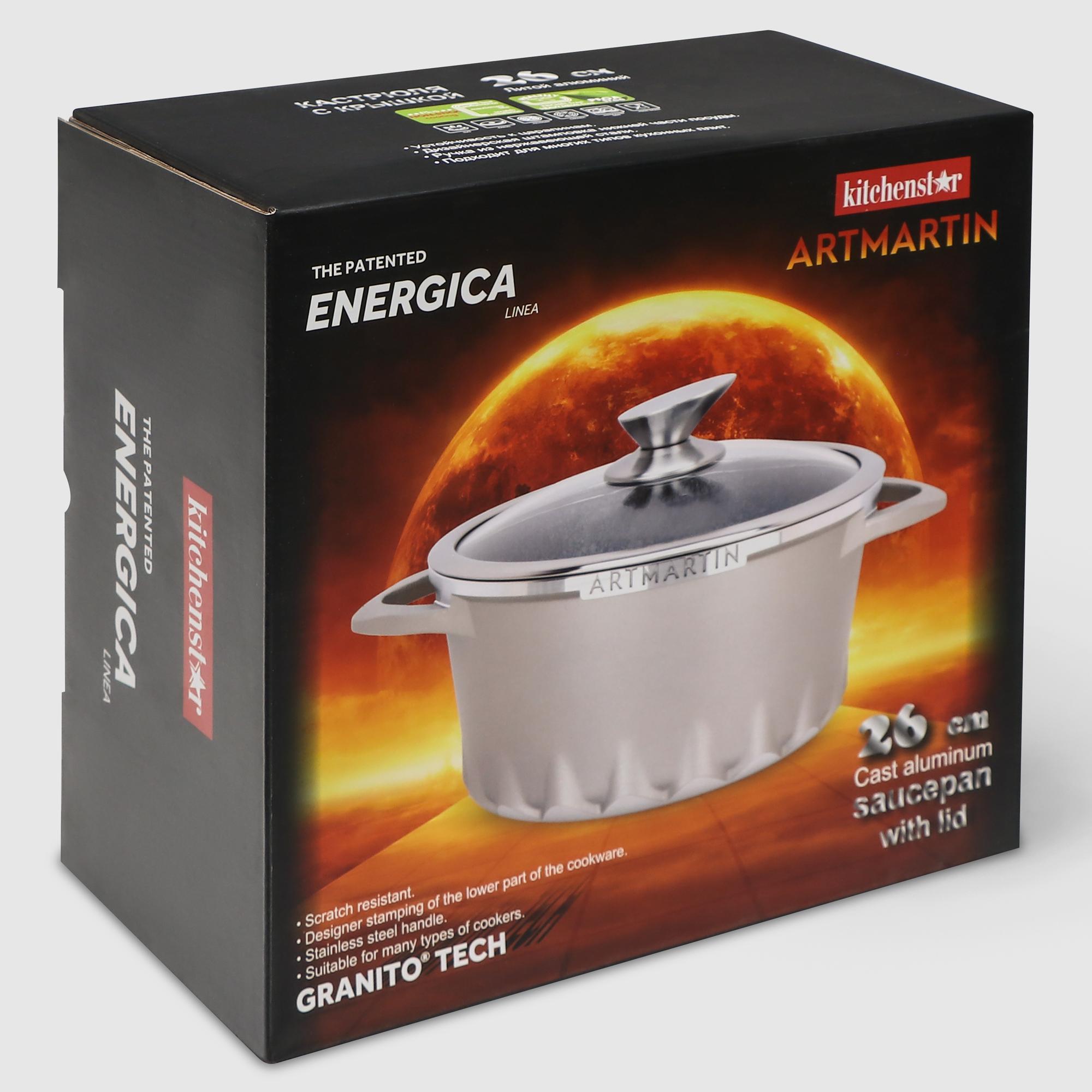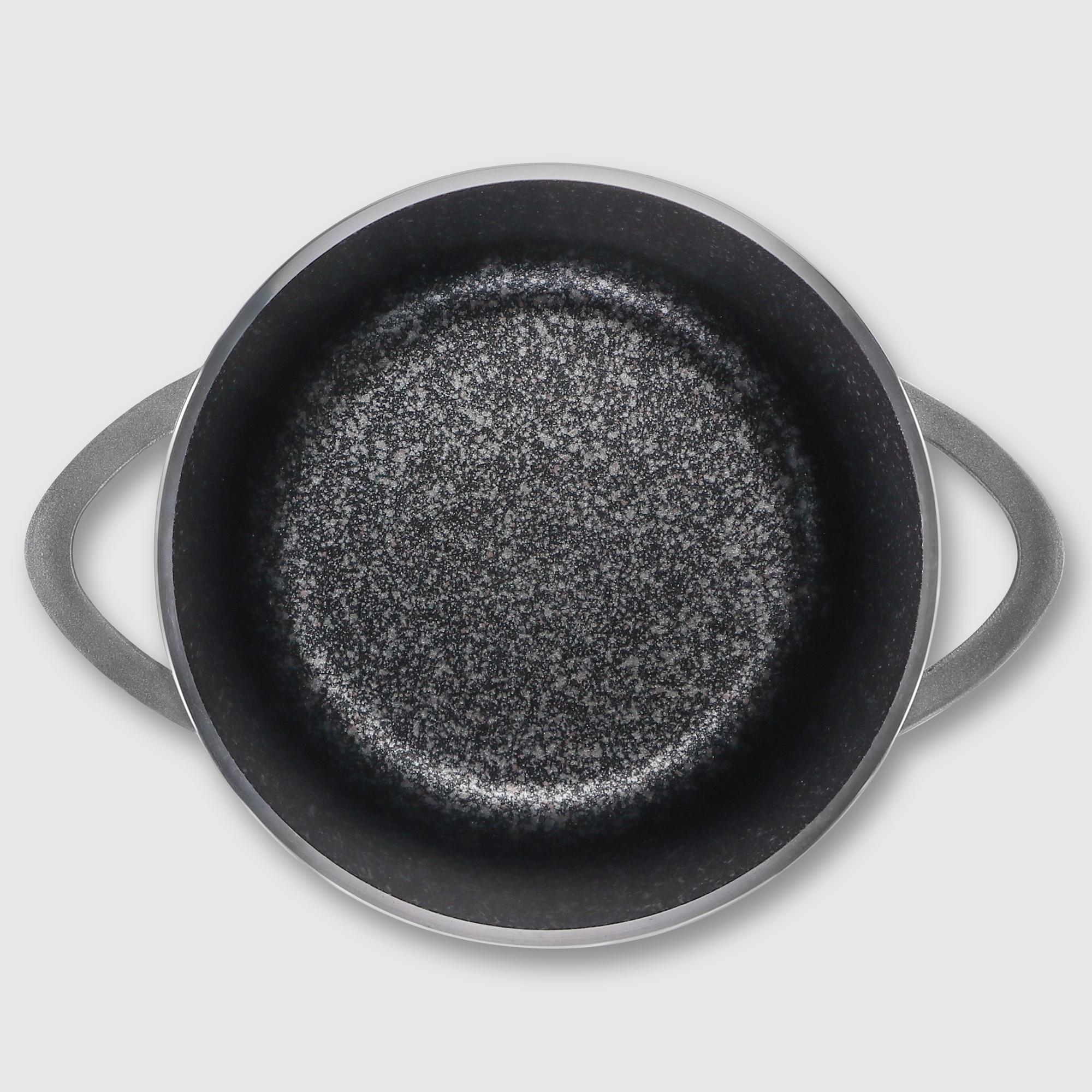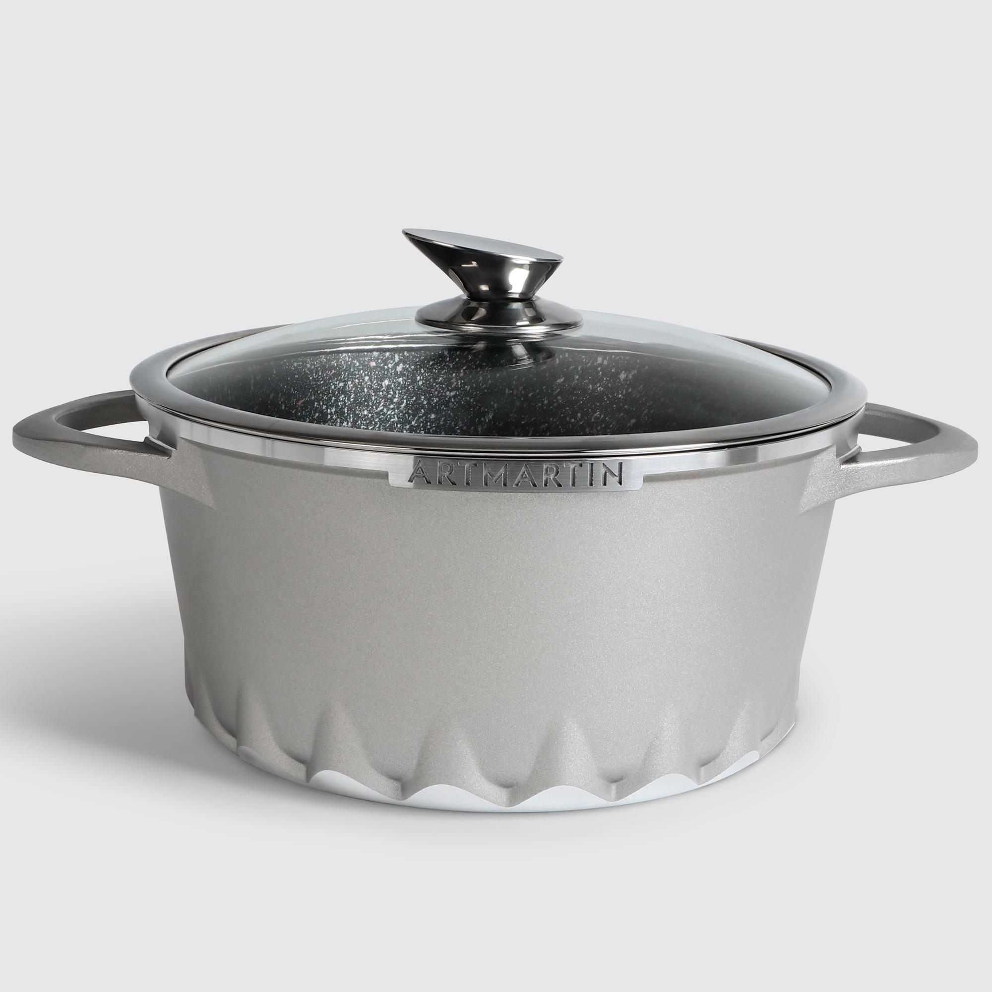 Кастрюля с крышкой 26 см обьемом 5,7 литра изготовлена из литого алюминия, устойчива к царапинам и износу. У кухонной посуды имеет ферромагнитную пластину, благодаря чему возможно использование на индукционных плитах. Толщина дна в 5 мм не позволит вашему блюду пригореть и сохранит первоначальный внешний вид посуды без деформации. Антипригарное покрытие полностью безопасно, так как не содержит опасных примесей. Крышка кастрюли с нержавеющим ободком и пароотводом. Кастрюля с крышкой подойдет для всех типов плит.