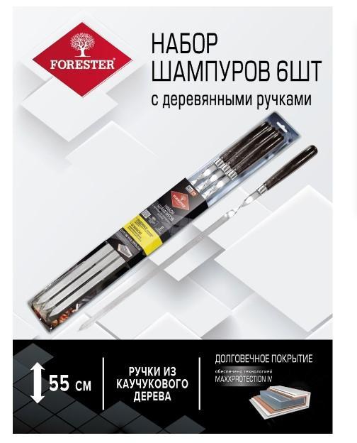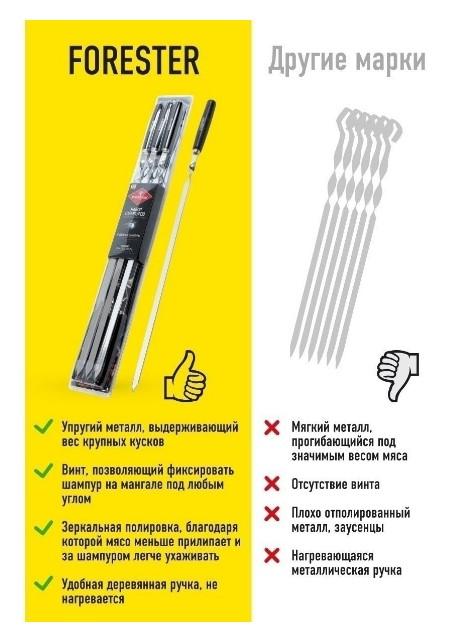 Набор шампуров с деревянными ручками Forester в блистерной упаковке предназначен для приготовления шашлыков из мяса, а также других видов продуктов птицы, рыбы, овощей. За счет оптимального баланса упругости и гибкости стали, на эти шампуры можно смело нанизывать крупные куски мяса, куриные окорочка или мясо на ребрышках. В производстве шампуров с деревянной ручкой Forester использовалась безопасная пищевая сталь, а антикоррозийное покрытие гарантирует изделиям длительный срок эксплуатации. Зеркальная поверхность без заусенцев служит защитой от прилипания продуктов к поверхности шампура во время жарки. Шампуры с деревянной ручкой по праву считаются наиболее удобными при переворачивании. Ведь дерево, благодаря специальной пропитке, практически не нагревается и не обжигает руки. Однако, перед тем, как купить шампура для шашлыка с деревянной ручкой, стоит убедиться, что их длина хотя бы на 5-7 см превышает ширину мангала. В представленном наборе она оптимальна 55 см. Шампуры с деревянными ручками идеально подход
