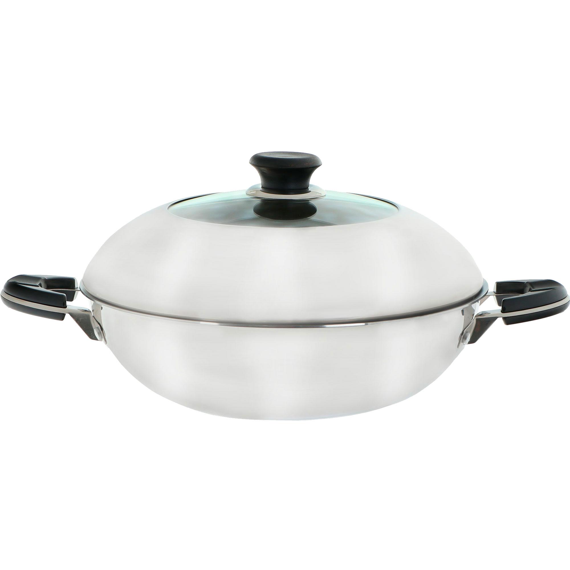 Вок бренда Vantage изготовлен из нержавеющей стали, благодаря чему, несмотря на высокий уровень прочности и долговечности, он легок и не требует особого ухода. Трехслойные толстые стенки и дно с внутренней прослойкой из алюминия гарантируют отсутствие деформации и сильного перегрева. Стальная крышка со стеклянной вставкой и пластиковые держатели в ручках добавляют эргономичности и удобства во время готовки.
