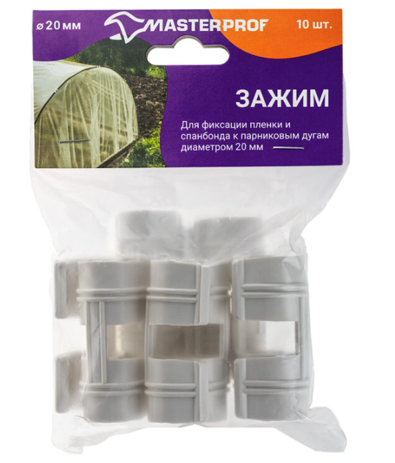 Зажим для плёнки к дугам парника надежно прижимает покрытие к каркасу, выполненного из пластиковых или металлических труб диаметром 20 мм.