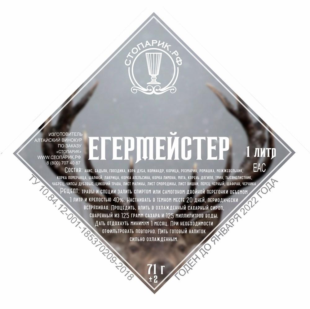 Набор трав и специй «Егермейстер» для настаивания крепких напитков. Обладает легким цитрусовым ароматом, а также ароматом специй и пряностей, придает легкий натуральный оттенок и наделяет своими полезными свойствами. Изготовлено из натуральных трав и специй. Инструкция указана на упаковке.