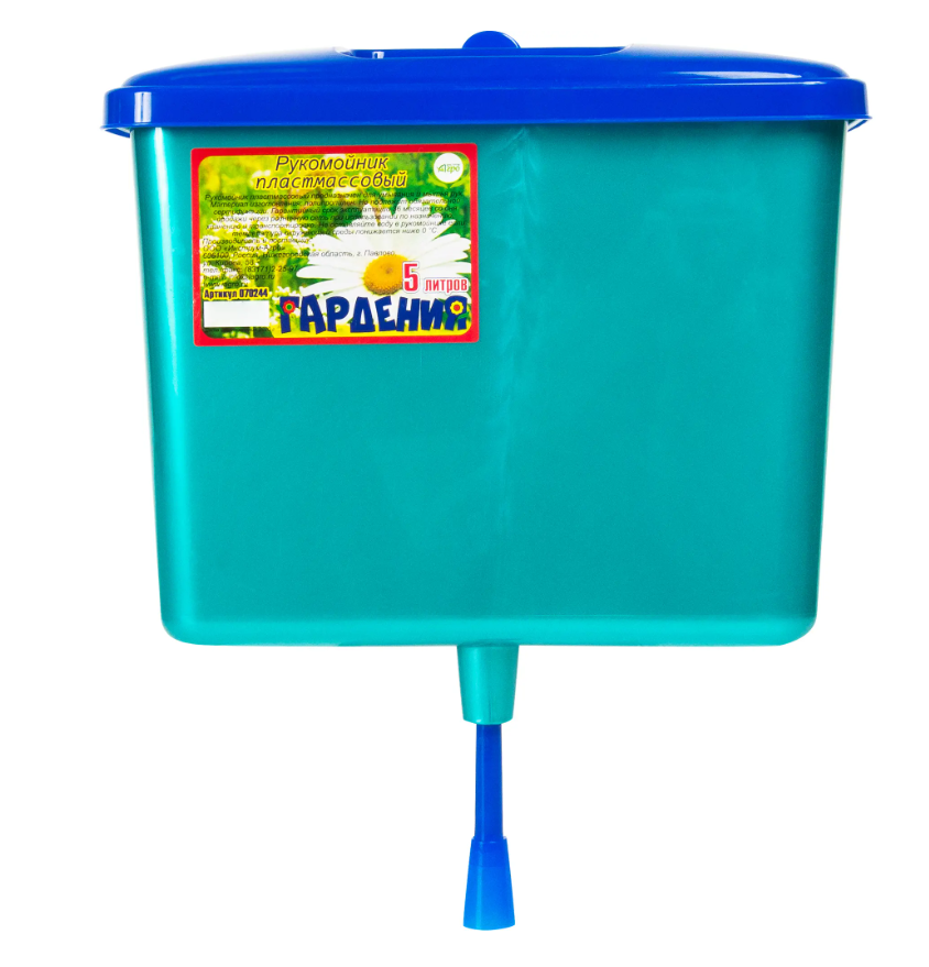 Рукомойник дачный «Гардения» — подвесной сосуд для умывания, мойки посуды, фруктов, овощей, ягод. Используется в местах, не оборудованных водопроводом. Может устанавливаться и внутри помещений, и на улице. Модель изготовлена из полипропилена с добавлением голубого красителя, имеет прямоугольную форму. Конструкция снабжена крышкой и подвижным стержнем для подачи воды. При температуре ниже 0˚ С воду из емкости следует сливать. Размеры изделия — 274 × 230 × 140 мм, объем — 5 л. Товар произведен в России. Гарантия — 2 года.