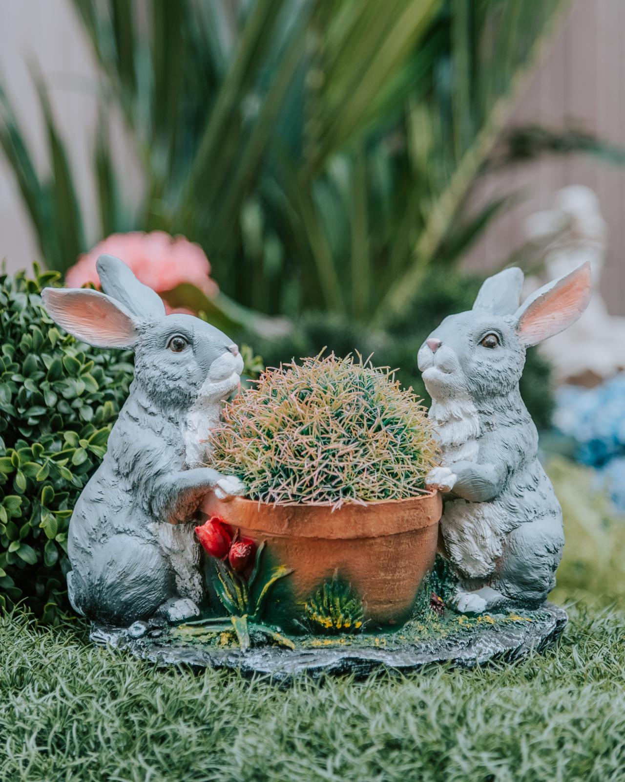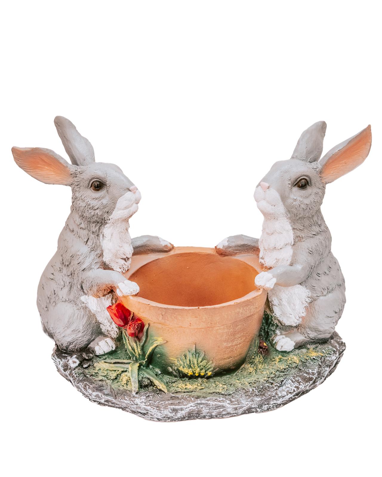 Необычное кашпо «Два зайца у горшка с цветком» понравится всем владельцам дома. Идеально подойдет для украшения вашего приусадебного или дачного участка. Сувениры из полистоуна сделают дворик особенно красивым. Садовая фигура будет отлично смотреться и радовать своих владельцев долгие годы. Фигура садовая долговечна, материал покрытия не боится дождя и снега, а потому такое кашпо способно радовать своих владельцев долгие годы. Садовые фигурки и статуэтки - это лучший подарок на день рождения и юбилей подруги, бабушки и сестры или годовщину мамы и папы точно придется в радость и понравится больше, чем повседневные вещи.