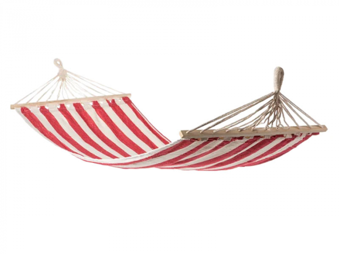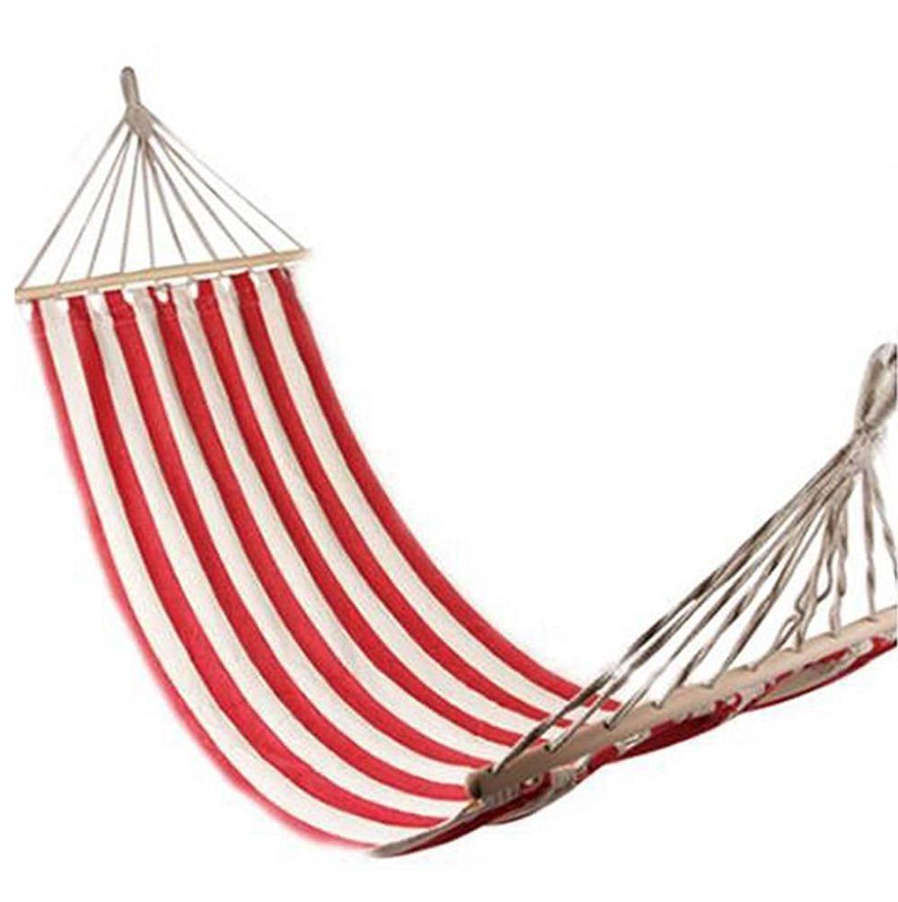 Гамак имеет привлекательный дизайн с белым полотном и красными полосками. Он станет не только функциональным предметом, но и стильным акцентом в вашем саду или на вашей террасе.
