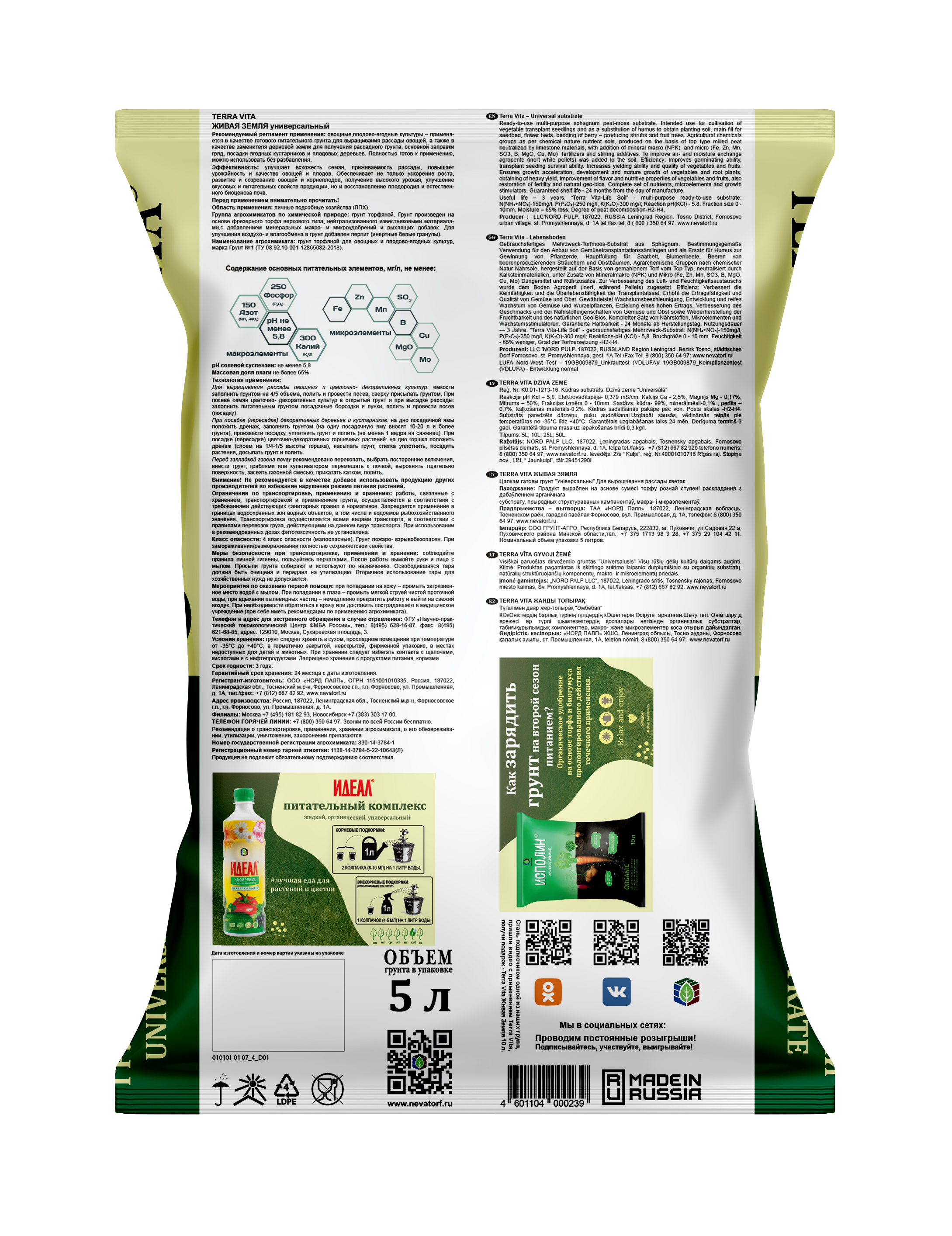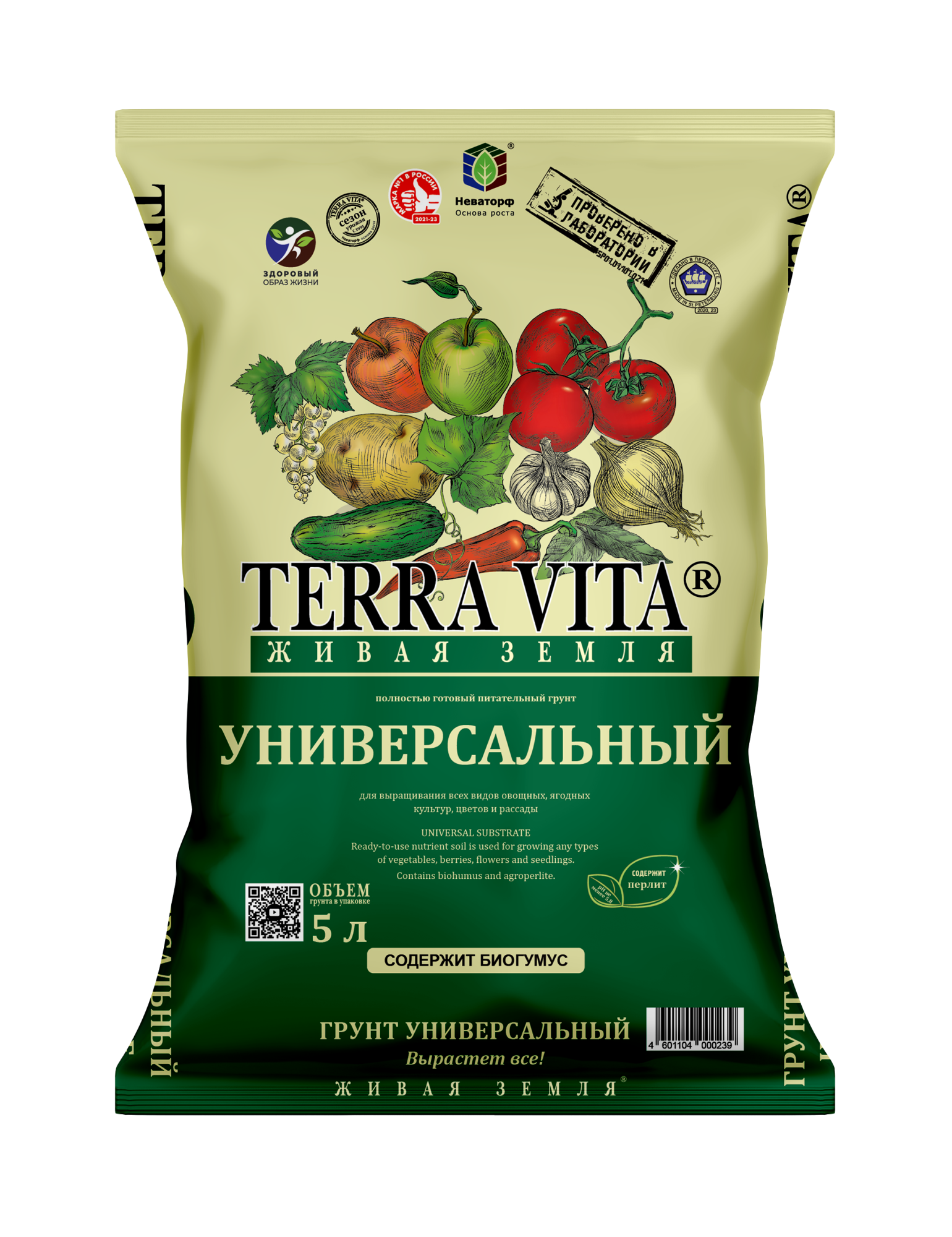 Универсальный грунт Terra Vita полностью готов к применению , он используется для выращивания всех видов овощных и ягодных культур, а также для цветов и рассады. Питательный грунт Terra Vita улучшает вкусовые и питательные свойства продукции , также он улучшает всхожесть семян и приживаемость рассады. Стимулятор роста в составе универсальной почвенной смеси позволяет не только ускорить развитие растений, но и стимулирует его корнеобразование. Грунт Terra Vita рекомендуется для заправки грядок и клумб, культивирования овощных и фруктовых культур, а также для выращивания саженцев плодовых деревьев и ягодных кустов. Достоинства универсального грунта заключаются в содержании гумуса с множеством биологически активных компонентов, обогащении минеральными компонентами , также оптимальной кислотности и длительном сохранении биоценоза почвы. Благодаря множественным преимуществам универсальная земля пользуется высокой популярностью среди цветоводов и садоводов.