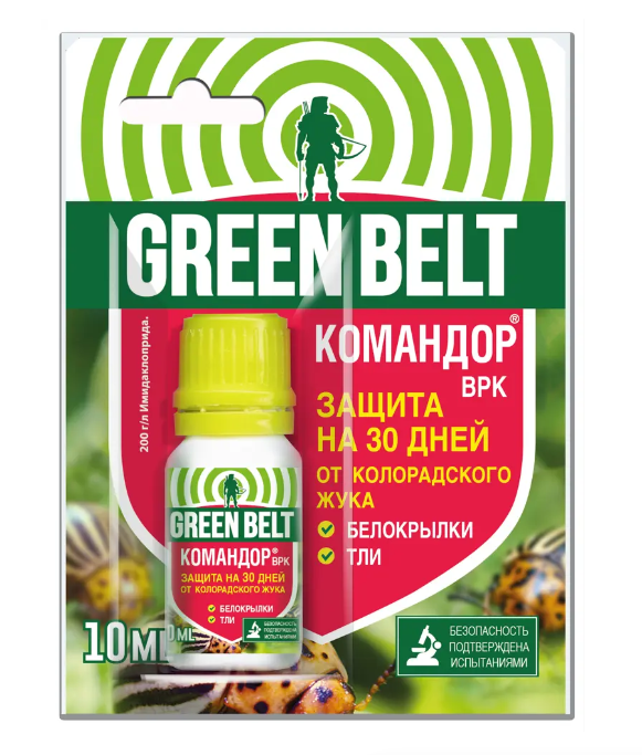 Средство от насекомых «Командор Грин Бэлт» — инсектицид контактного и системного действия для борьбы с распространенными стойкими насекомыми-вредителями (тлей, колорадским жуком, белокрылкой, трипсами). Обладает пролонгированным действием за счет проникновения в верхний слой листьев и устойчивости к смыванию дождем. Работы с препаратом проводятся в средствах защиты.