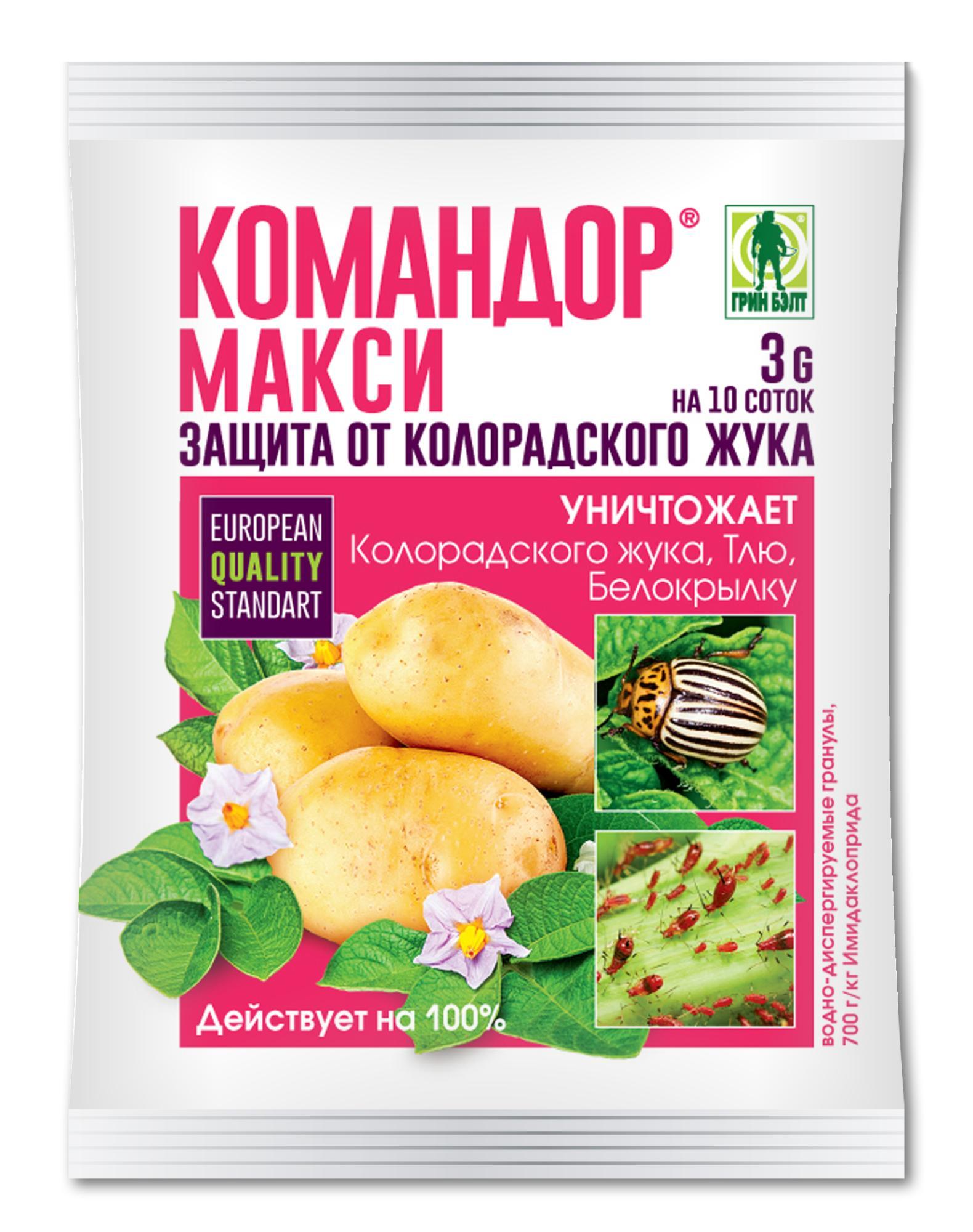 Действует быстро. Действует долго. Действует на 100%!КОМАНДОР — одна из новейших разработок из класса препаратов на основе имидаклоприда, которые получили самое широкое распространение в мире. Теперь новая препаративная форма – водно-диспергируемые гранулы (ВДГ)! Преимущества препарата КОМАНДОР МАКСИ: Высокая эффективность действия 100% на третий день после обработки; защищает растения не менее 3-х недель; уничтожает самых стойких вредителей; действует в жаркую погоду; экономичность – пакет 1 грамм рассчитан на 3 сотки (3 грамма на 10 соток) картофеля.