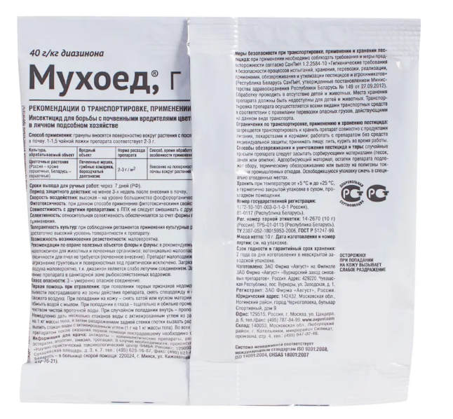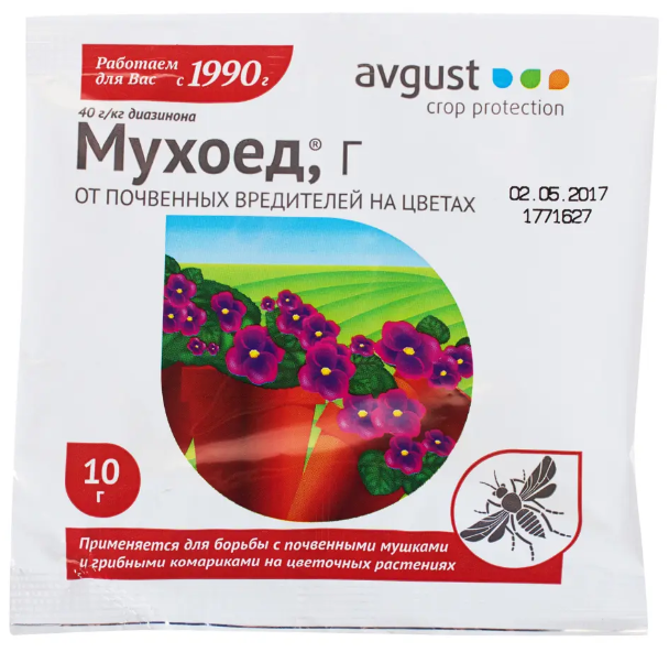 редство «Мухоед» — это высокоэффективный продукт для борьбы с почвенными вредителями на комнатных растениях и овощных культурах. Данный товар способен уничтожить как взрослых насекомых, так и их личинки. Гибель вредителей наступает в течение двух суток после обработки. Средство характеризуется длительным периодом защитного действия и отвечает самым современным требованиям.