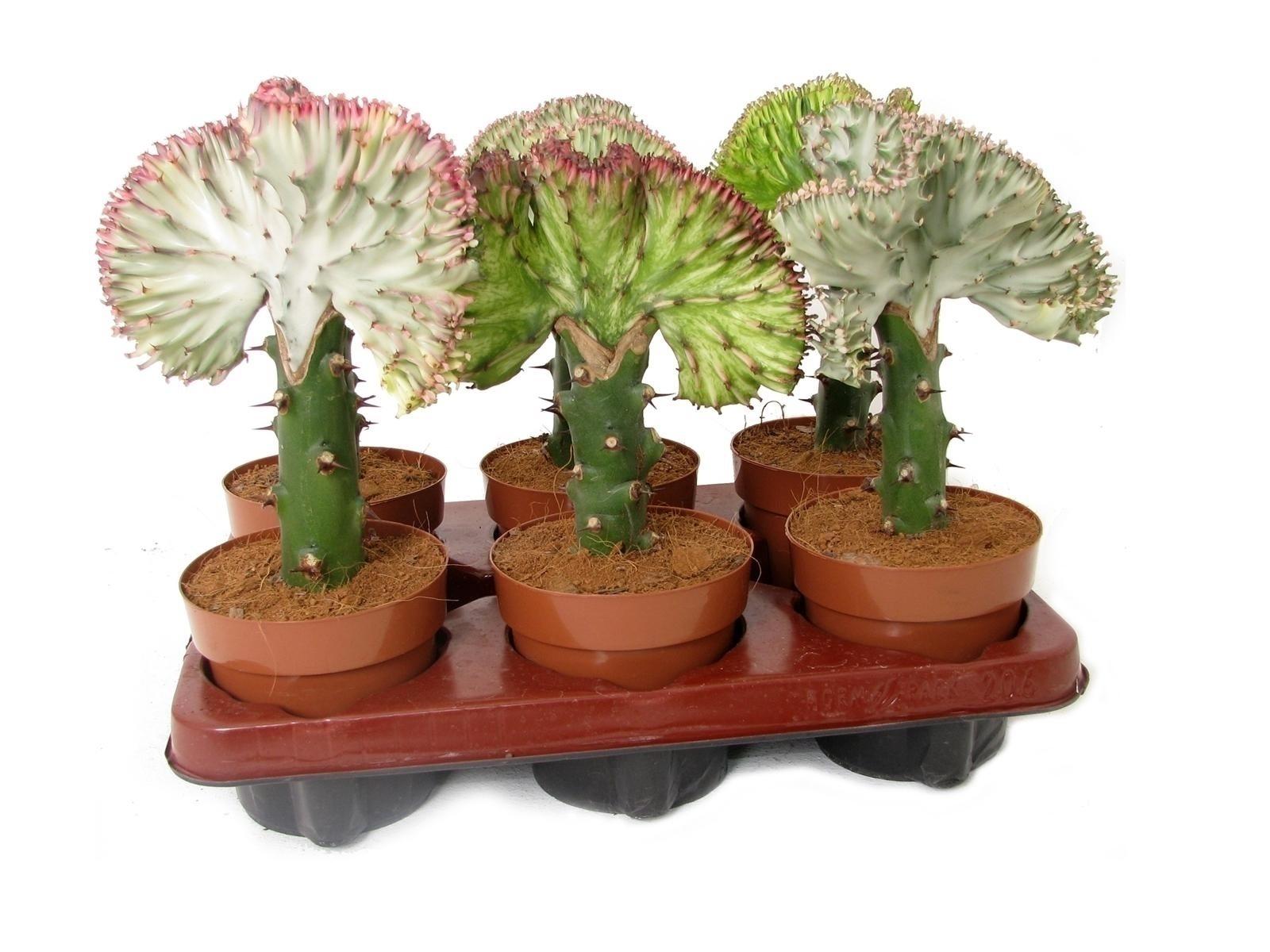 Куст взрослой эуфорбии вида кристата напоминает веер, хотя многие видят сходство с кораллом. Поверхность побегов неровная, если не сказать, шишковатая. По контуру побегов расположены зубцы, крупные колючки.Это растение цветущее. Цветы по размерам маленькие, а располагаются по краям гребеньков. Увидеть их можно только на дикорастущих сортах, дома цветение наступает очень редко.