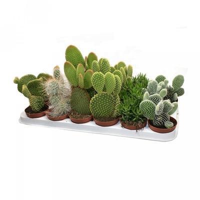 Опунция Микс - эффектный, красиво-цветущий кактус. Растение имеет стелющийся стебель и насыщенно-зелёные плоские побеги, округлой и напоминающей заячьи уши формы. Стебель этой опунции достаточно мясистый и сочный. Опунция Микс покрыта небольшим количеством коричневых колючек.