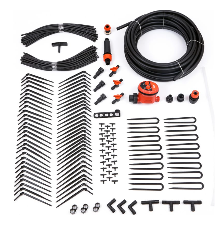 Электронный таймер;¶Шланг магистральный 18 м;¶Шланг подающий 40 см - 60 шт.;¶Капельницы - 60 шт.;¶Штуцер присоединения к ёмкости;¶Трубка уровень прозрачная 1 м;¶Подвес для трубки уровня - 1 шт;¶Тройник малый - 30 шт.;¶Кран - 3 шт.;¶Уголок для магистрального шланга - 3 шт.;¶Тройник большой - 3 шт.;¶Заглушка для магистрального шланга - 3 шт.;¶Прижим для магистрального шланга -16 шт.;¶Шило для магистрального шланга - 1 шт.;¶Штуцер 1/2" (для соединения с ёмкостью) - 1 шт.;¶Штуцер 3/4" (для монтажа фильтра) - 2 шт.;¶Фильтр тонкой очистки - 1 шт.;¶Коробка.