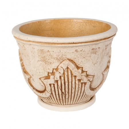 Цветочный горшок изготовлен из шамотной глины высокотемпературного обжига. Изнутри покрыт специальной кварцевой глазурью. Выполнен в бежевом цвете с коричневым цветом в области узора. Декорирован узорами в виде листьев с лучами внутри по низу горшка. Горшок по форме напоминает классический горшок с ободком вверху. Преимущества: Экологически чистый материал, не содержит вредных примесей Горшки обладают высоким сроком службы, более 10 лет Подходит для посадки любых растений Не протекает, не гниет и не болеет грибком Благоприятен для роста и развития растений Подходит для использования в помещениях и на улице Эстетически вписывается в любой интерьер, дополняя растение Описание Горшок керамический "Корефей" выполнен в виде среднего классического горшка с расширяющимися краями вверху. Он украшен оригинальным объёмным узором в виде листьев с лучами внутри, выделенным коричневым цветом и ободком по верхнему краю. Шамотная глина, из которой изготовлен