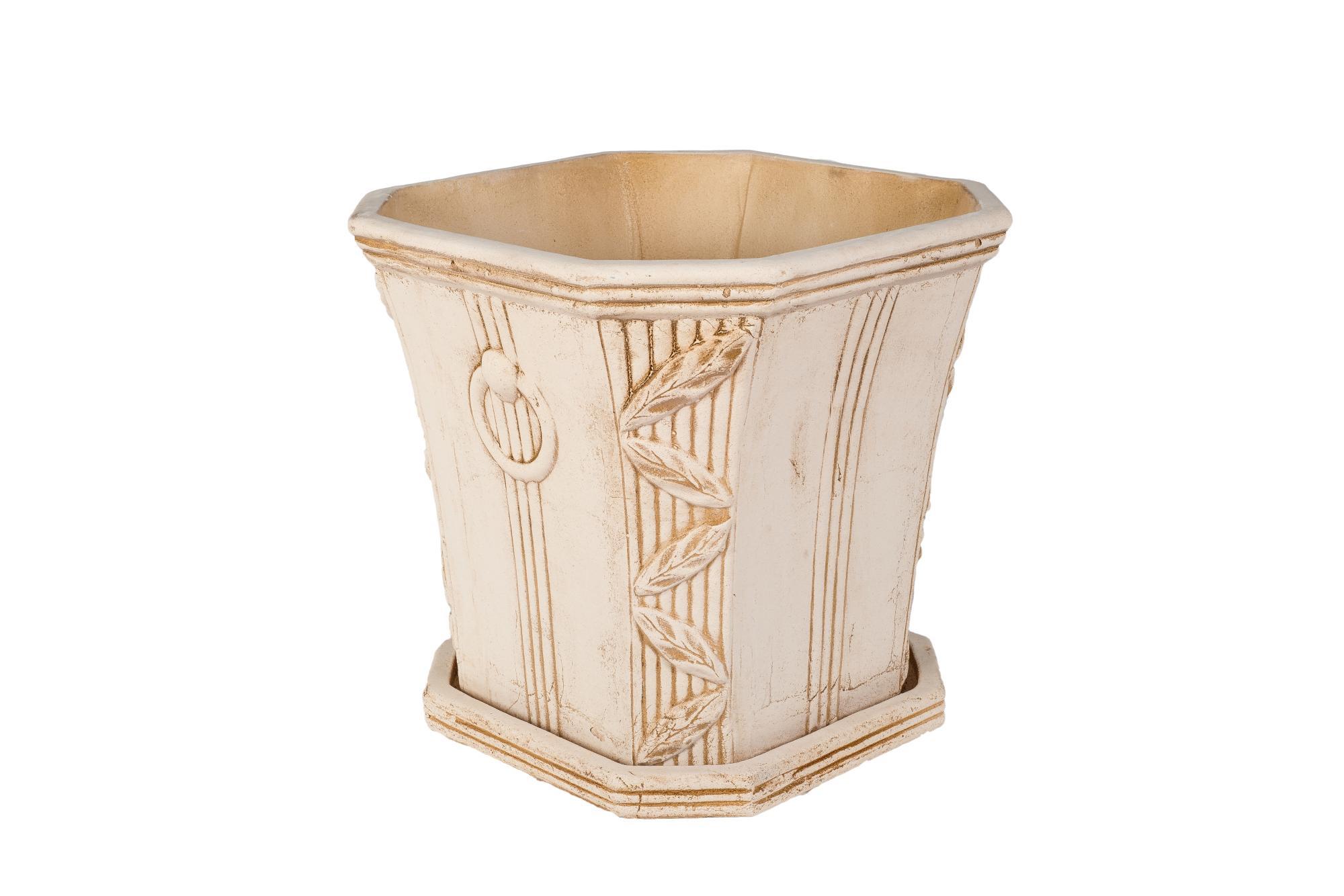 Объём: 60л Цветочный горшок изготовлен из шамотной глины высокотемпературного обжига. Изнутри покрыт специальной кварцевой глазурью. Выполнен в бежевом цвете, по линии узора выделен коричневым цветом. Декорирован орнаментом из лавровых листьев, расположенном по бокам на четырёх гранях, и в центре рельефным кольцом, как на двери в древние века. Горшок по форме напоминает большой горшок, имеющий в поперечном сечении – многоугольник, слегка сужающийся книзу. Преимущества: Экологически чистый материал, не содержит вредных примесей Горшки обладают высоким сроком службы, более 10 лет Подходит для посадки любых растений Не протекает, не гниет и не болеет грибком Благоприятен для роста и развития растений Подходит для использования в помещениях и на улице Эстетически вписывается в любой интерьер, дополняя растение Описание Горшок керамический Кронос выполнен в большом размере, в виде большого горшка с расширяющимися краями, имеющего в поперечном разрезе восьмиу