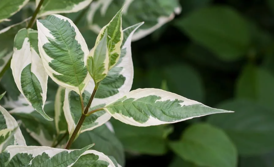 Высота 1,2-1,5 м. Крона с вертикально растущими, неразветвленными побегами, компактная. Побеги красно-коричневые или вишневые, имеют красивый, более насыщенный цвет в зимний период. Растет довольно быстро. Листья яркие, зеленые или темно-зеленые с белым окаймлением и мазками, более светлые с нижней стороны. Осенью окрашиваются в пурпурно-красный цвет. Цветет желтоватыми, немногочисленными, мелкими цветками, собранными с щитковидные соцветия. Немногочисленные плоды шаровидные, ягодообразные, поначалу белые, затем приобретают бледно-голубой цвет.
