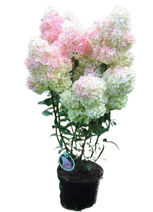 Листья удлиненные, яйцевидные, шероховатые, мелкозубчатые по краю, с четко выраженным жилкованием, темно-зеленые, жесткие. Цветение обильное и продолжительное, с середины июня до конца сентября. Соцветия средние, пирамидальные, плотные, состоят из стерильных (крупных, придающих особую декоративность) и фертильных (мелких, образующих семена) цветов. При распускании цветы кремовые, очень быстро розовеют, к осени становятся малиновыми.