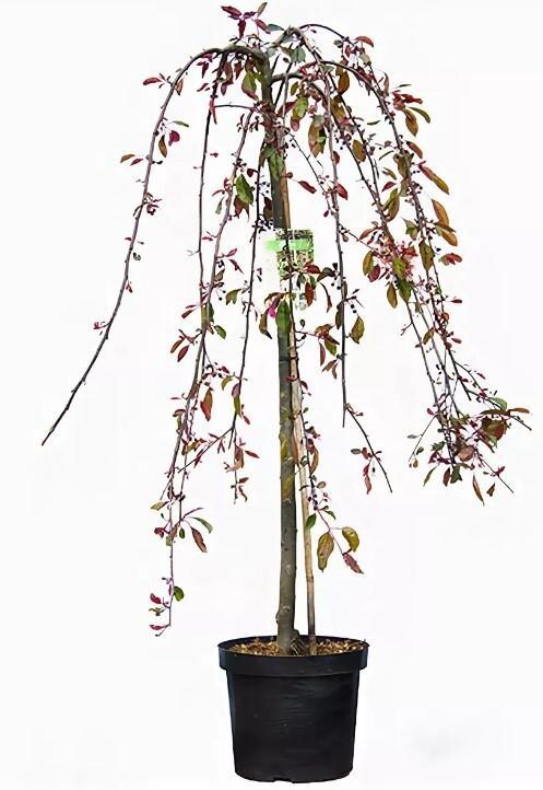 Яблоня Роял Бьюти на штамбе 120 см - Самый красивый сорт декоративной яблони с плакучей кроной. Высота 2-3 м. Цветки тёмно-розовые (пурпурно-красные). Цветение обильное, в мае. Молодая листва бордовая, затем тёмно-зелёная с бордовым оттенком на нижней стороне. Плоды красные, долго не опадают. Место солнечное. Почва дренированная.