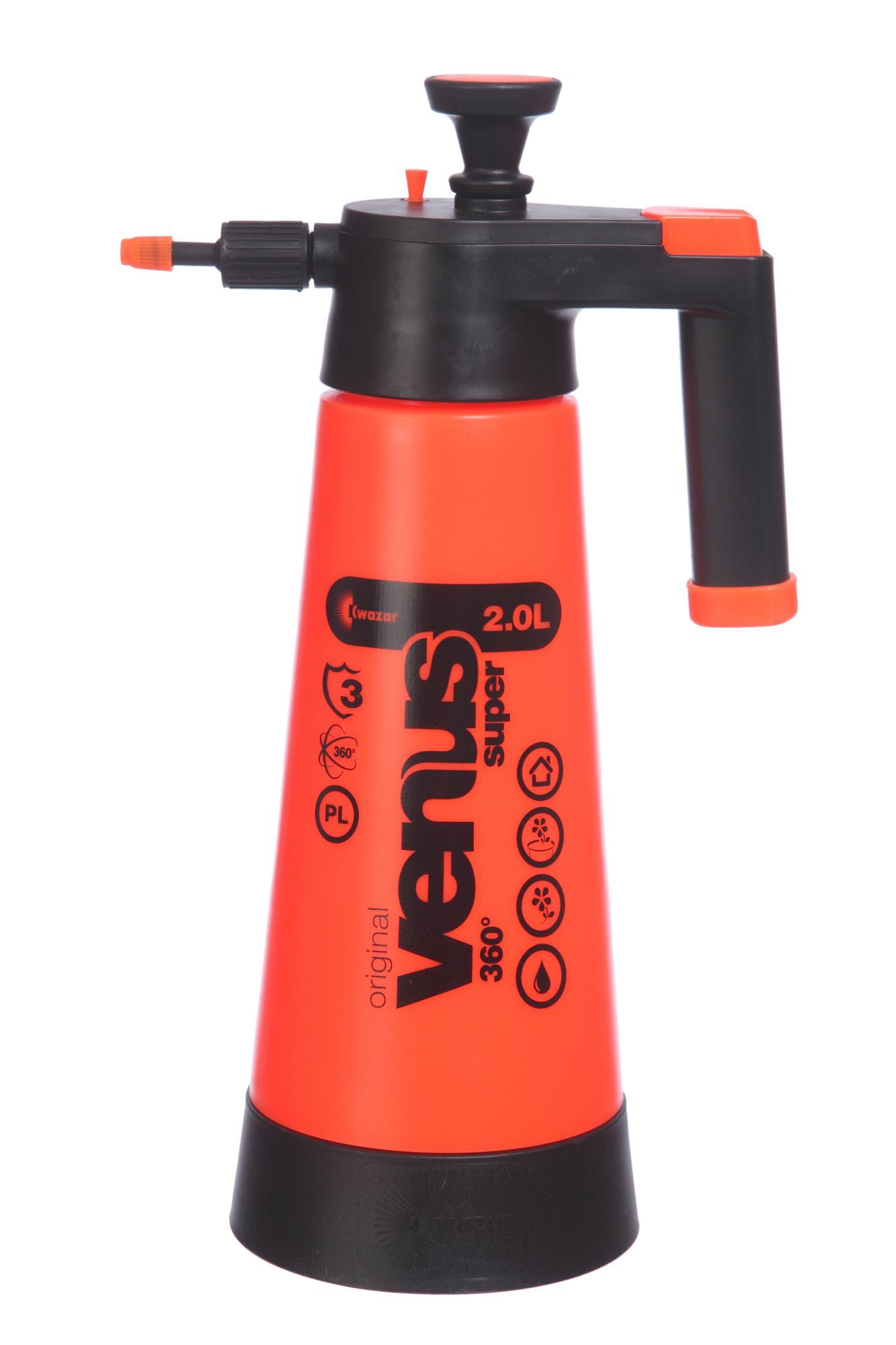 VENUS SUPER - серия опрыскивателей объемом 1л;1,5л;2л, предназначены для применения дома, на даче, в палисаднике и дезинфекции. Допускается работать с растворами рН от 5 до 7 Описание: -шарнирный носик - обеспечивает обработку в труднодоступных местах -система 360 - возможность распыления жидкости в любом положении и даже в перевернутом -прозрачная шкала уровня жидкости - удобная дозировка и контроль расхода -регулируемая форсунка - настройка распыления от струи до "зонтика" -стабилизирующее кольцо - защищает дно колбы от повреждений -клапан безопасности - позволяет держать давление под контролем -эргономичная ручка - удобство работы -гарантия 3 года на колбу Venus, 2 года на аксессуары