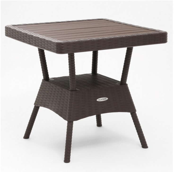 Столешница выполнена из террасной доски. Изделия из террасной доски обладают целым набором преимуществ: выдерживают существенные нагрузки, при должном уходе и обработке служат не менее 20 лет, допускается влажная и сухая очистка, это морозо- и влагостойкий материал. Подходит для использования внутри помещения и на открытом воздухе. Станет отличным дополнением обеденной зоны с креслами из коллекции Ola Dom. Он рассчитан на компанию из 4 — 6 человек. Серия - аналог ротанга. Страна производства — Россия. Гарантия производителя — 2 года.