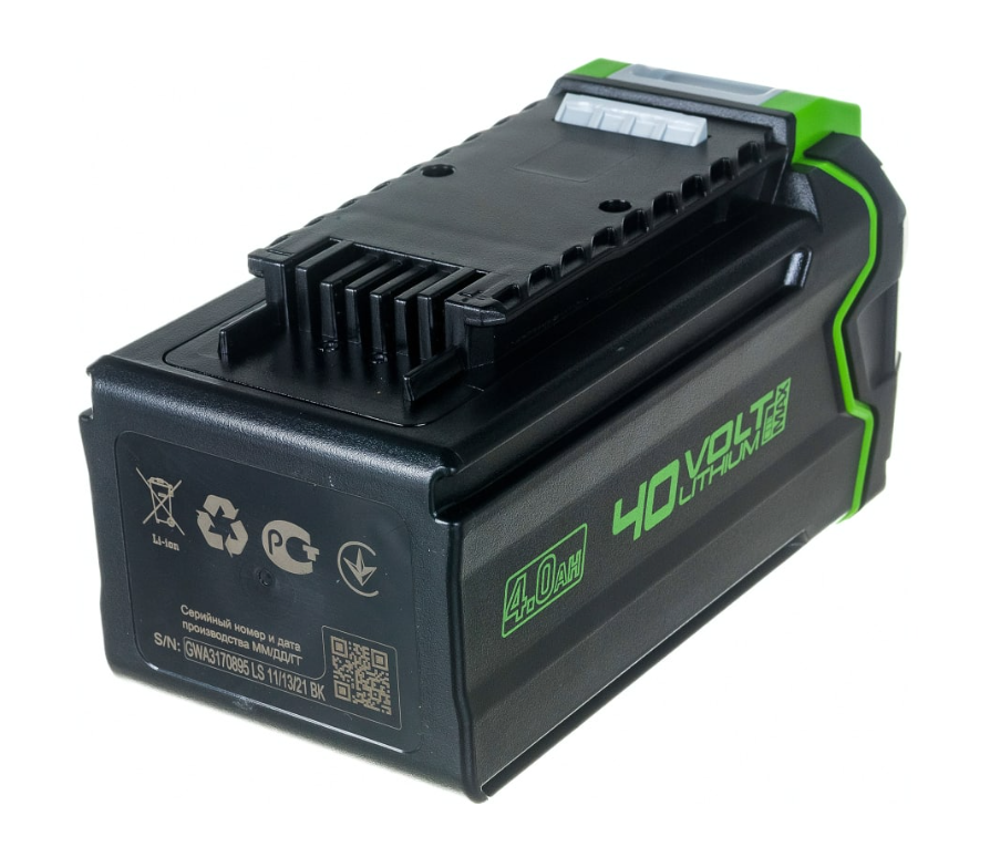 Аккумулятор Greenworks G40B4 40 вольт - это литий ионная (Li-ion) батарея, выполненная по самой современной технологии. Этот аккумулятор может использоваться для питания всех устройств Greenworks линейки G-MAX 40V. Аккумулятор состоит из ячеек самого высокого класса А++. Батарея снабжена платой управления, благодаря которой ячейки заряжаются и разряжаются равномерно и одновременно, а также чипом для защищены от перезаряда, перегрева и глубокого разряда. Это избавляет от эффекта потери мощности инструмента при разряде, а также значительно продлевает срок жизни аккумулятора в среднем на 7 лет - до 2000 циклов заряда-разряда.