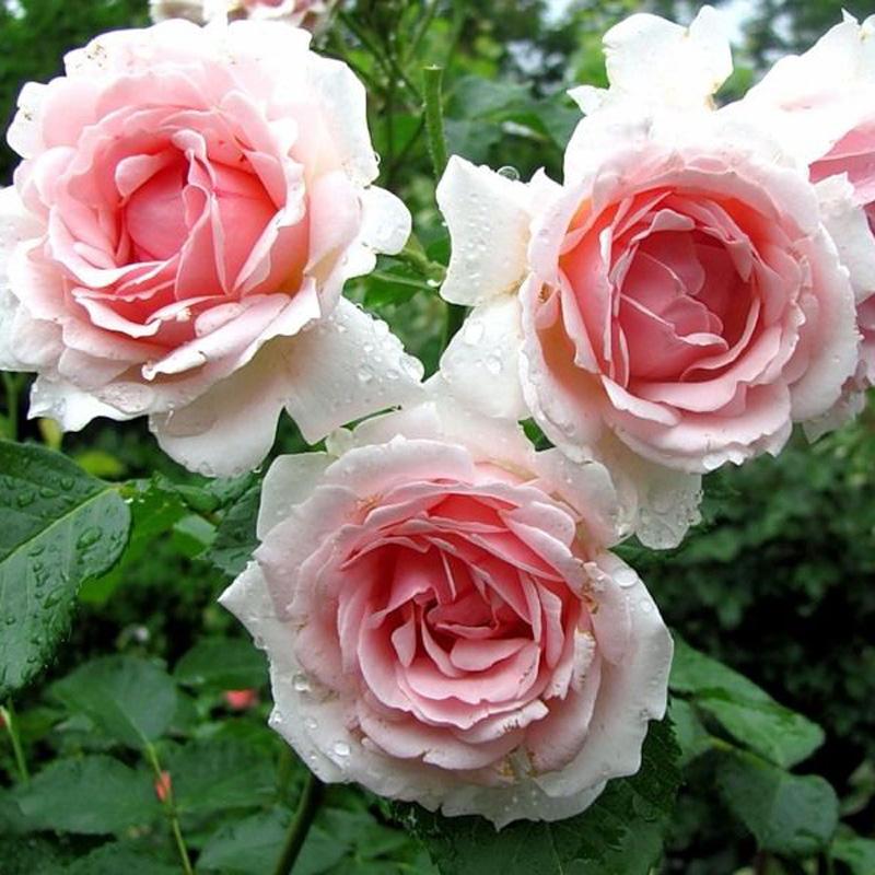 Цветы бледно-розовые, крупные, махровые, чашевидные, собраны в соцветия, на одном стебле распускается от 3 до 5 штук.