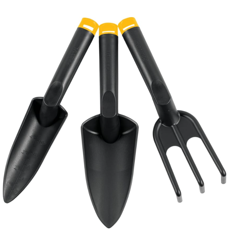 Набор садовых инструментов. Прочный пластик, армированный стекловолокном. Отверстия для подвешивания. В наборе 3 предмета.