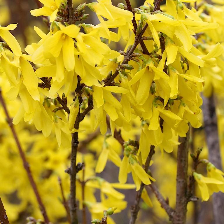 Форзиция промежуточная Голден Заубер - Среднерослый раскидистый куст с тонкими побегами высотой до 2 м. Листья тёмно-зелёные, с нижней стороны светлее. Цветёт крупными цветками насыщенной золотисто-жёлтой окраски в конце апреля - начале мая 20 дней. Крупные насыщенного цвета соцветия имеют лёгкий аромат. К осени меняет цвет листьев на бронзово-красный. В суровые зимы молодые приросты могут подмерзать, но быстро восстанавливаются. На зиму рекомендуется укрывать сухим листом, лапником, пригибать ветви к земле. Предпочитает солнечные места, защищённые от ветра. Прекрасно смотрится как в одиночных, так и групповых посадках.