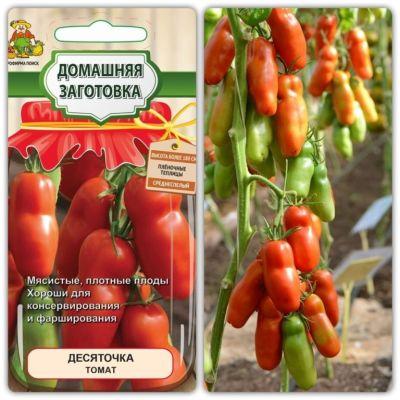 Семена томатов. Семена томата "Десяточка" Поиск серия Домашняя заготовка. Мясистые, плотные плоды Хороши для консервирования и фарширования Удлиненная форма плода, хороши для консервирования и фаршировки. Среднеспелый сорт для пленочных теплиц. Период от всходов до начала плодоношения 115-120 дней. Растение индетерминантное, высотой более 180 см, нуждается в подвязке и формировании. В кисти 3-6 плодов удлиненно-цилиндрической формы, гладкие, ярко- красные, длиной до 10 см, массой 110-130 г, мясистые, плотные, малосемянные. Для свежего потребления, цельноплодного консервирования, фарширования. Устойчив к стрессовым условиям выращивания.