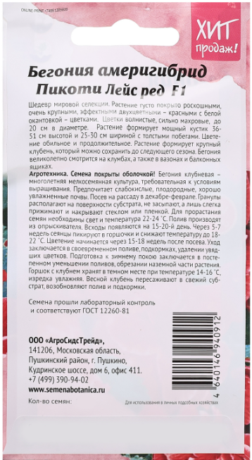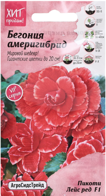Шедевр Мировой селекции. Растение густо покрыто роскошными очень крупными эффектными двухцветными цветками. Цветки волнистые, сильно махровые, до 20 см в диаметре. Растение формирует мощный кустик 36-51 см высотой и 25-30 см шириной с толстыми побегами. Цветение обильное и продолжительное. Растение формирует крупный клубень, который можно сохранить до следующего сезона. Бегония великолепно смотрится на клумбах, а также в вазонах и балконных ящиках. Агротехника: Семена покрыты оболочкой! Бегония клубневая – многолетняя мелкосемянная культура, требовательная к условиям выращивания. Предпочитает слабокислые, плодородные, хорошо увлажненные почвы. Посев на рассаду в декабре-феврале. Гранулы располагают на поверхности субстрата, не засыпают, а лишь слегка прижимают и накрывают стеклом или пленкой. Для прорастания семян необходим свет и температура 22-24˚С. Полив производят из опрыскивателя. Всходы появляются на 15-20 день. Через 5-7 недель сеянцы пикируют в горшочки и снижают температуру до 18-22˚С.