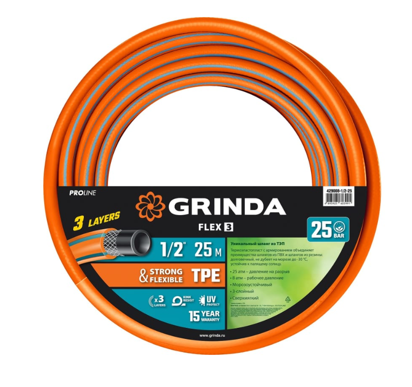Поливочный шланг Grinda PROLine FLEX 3 1/2", 25 м, 25 атм 429008-1/2-25 преназначен для поливочных работ на садово-огородном участке. Сверхмягкий, трёхслойный. Морозостойкий из термоэластопласта, Температурный диапазон хранения и транспортировки -30°С до +50°С, Рабочий диапазон от 0°С до +50°С. Устойчивый к ультрафиолетовым лучам. Не содержит вредных для окружающей среды веществ.
