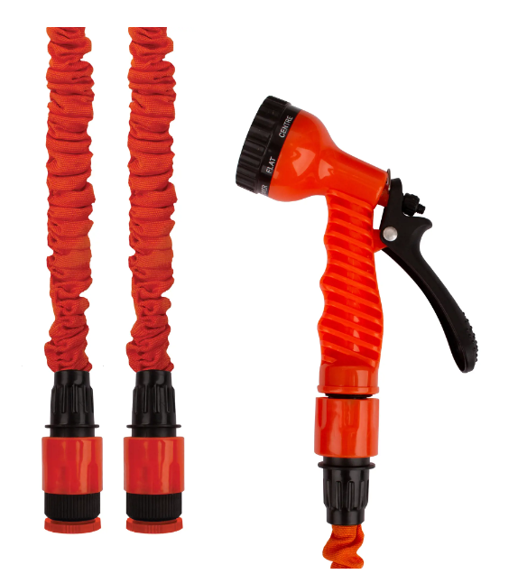 Шланг растягивающийся — отличное решение при недостатке места для хранения. При наполнении водой его длина увеличивается в несколько раз — до 22,5 м. Выдерживает давление до 6 бар. Изготовлен из латекса.