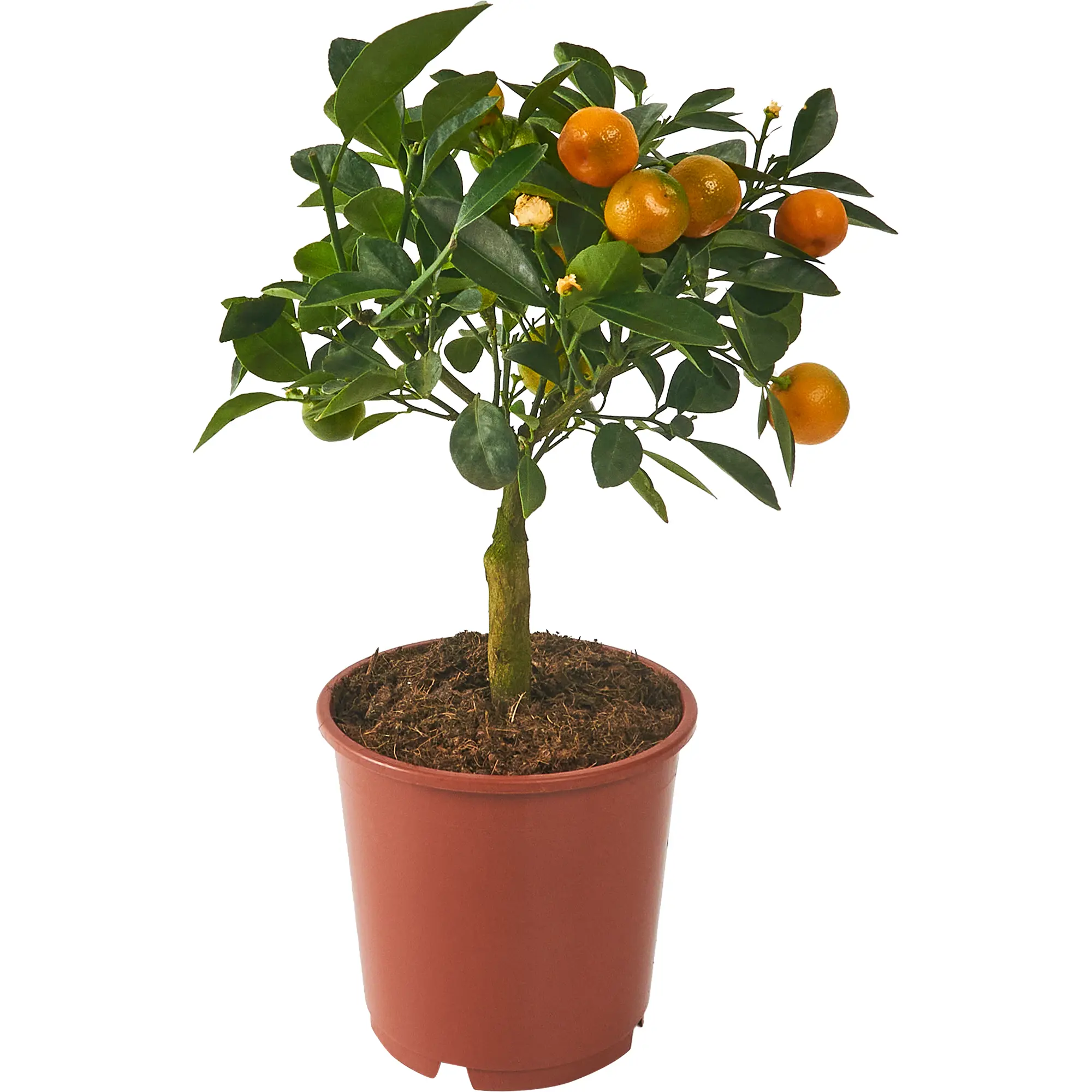 Цитрофортунелла Каламондин ø14 h35 см Цитрофортунелла — популярный гибрид семейства Рутовых, полученный в результате скрещивания Фортунеллы (Кинкана) с Мандарином. Представляет собой быстрорастущие, декоративные деревца с компактной кроной. На многочисленных ветвях размещены глянцевые, кожистые, овальной формы листья. Если потереть листовую пластинку, издается приятный аромат.Цитрофортунелла отличается от других представителей рода Цитрусовых отсутствием шипов на побегах. Дерево достигает в высоту до 1.2 м. Белые, душистые цветы массово развиваются летом, а одиночно — в любое время года. Этот представитель флоры особенно красив во время одновременного цветения и формирования оранжевых, подобных мелким апельсинам, плодов. Из-за их своеобразного, горьковато-кислого вкуса, плоды Цитрофортунеллы представляют собой больше декоративную ценность, чем служат в качестве съедобных плодов Цитрусовых. Растение неприхотливо в уходе. В оптимальных условиях для роста плодоносит круглый год.
