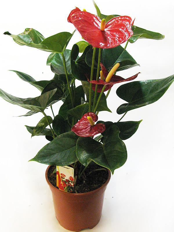 Антуриум (лат. Anthurium) - это вечнозеленое комнатное растение семейства Ароидные. Цветок по своей природе очень красив и имеет темно-зеленые сердцевидные листья, толстые стебли, соцветие в виде кукурузного початка и цветки, как и листья, сердцевидной формы, яркого красного окраса. Антуриум плодоносит небольшими ягодками. Они могут быть ярко-красные, черные, белые, полосатые или двухцветные.Несмотря на редкие внешние данные, Антуриум не очень требователен в уходе и отлично украсит собой любую обстановку.