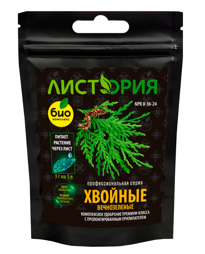Профессиональное минеральное удобрение премиум-класса с пролонгированным прилипателем для ЛИСТОВОЙ подкормки хвойных культур в течение всего сезона.