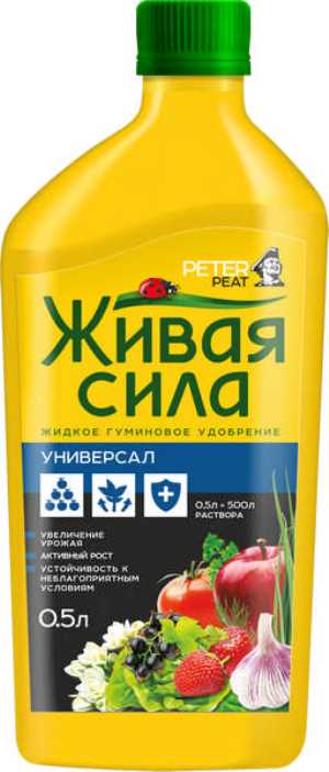 Жидкое удобрение Живая сила, Универсал, 0,5л Назначение Для овощных, плодовых, ягодных культур, садовых и комнатных цветов, газонных трав. Способствует росту растений, увеличению урожая, улучшает качество продукции, повышает устойчивость к неблагоприятным условиям окружающей среды. Применение Корневая подкормка: 30-50 мл удобрения на 10 л воды. Для всех культур – полив один раз в 10 дней (весна-лето), для комнатных растений – один раз в месяц (осень-зима). Некорневая подкормка: 10-30 мл удобрения на 10 л воды. Для всех культур – опрыскивание один раз в 10 дней (весна-лето), для комнатных растений – один раз в месяц (осень-зима). Замачивание семян, черенков, луковиц, клубней: 5 мл удобрения растворяют в 1 л воды, в приготовленном растворе замачивают семена, луковицы, клубни в течение 10-12 часов; черенки погружают в раствор на 1/3 длины на 24 часа. Массовая доля питательных веществ, г/л, не менее: Органическое вещество (в т. ч. гуминовые кислоты) – 20; Азот (N) – 1; Фосфор (Р2О5) – 11; Калий (К2О) – 12.