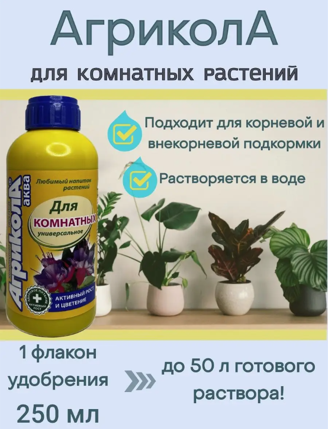 Концентрированное универсальное жидкое комплексное удобрение Агрикола Аква для комнатных растений. Удобрения Агрикола для комнатных цветов содержит основные элементы питания (азот, фосфор и калий), микроэлементы в особой хелатной форме и гуминовые биологически активные вещества-Энергены. Подкормка для комнатных растений помогают в усвоении элементов питания, активизирует иммунную систему растений, а также минеральный комплекс повышает устойчивость к неблагоприятным факторам. Применение удобрения Агрикола Аква усиливает рост, увеличивает продолжительность и интенсивность цветения, обеспечивает ярко-зелёную окраску листьев. Удобрение для комнатных цветов необходимо для активного роста и цветения следующих видов: декабрист, сансевиерия (тещин язык), замиокулькас, алоэ древовидное, каланхоэ, бегония, монстера, крассула (денежное дерево) и многих других. Удобрения для комнатных цветов возможно использовать для корневой и внекорневой подкормки.